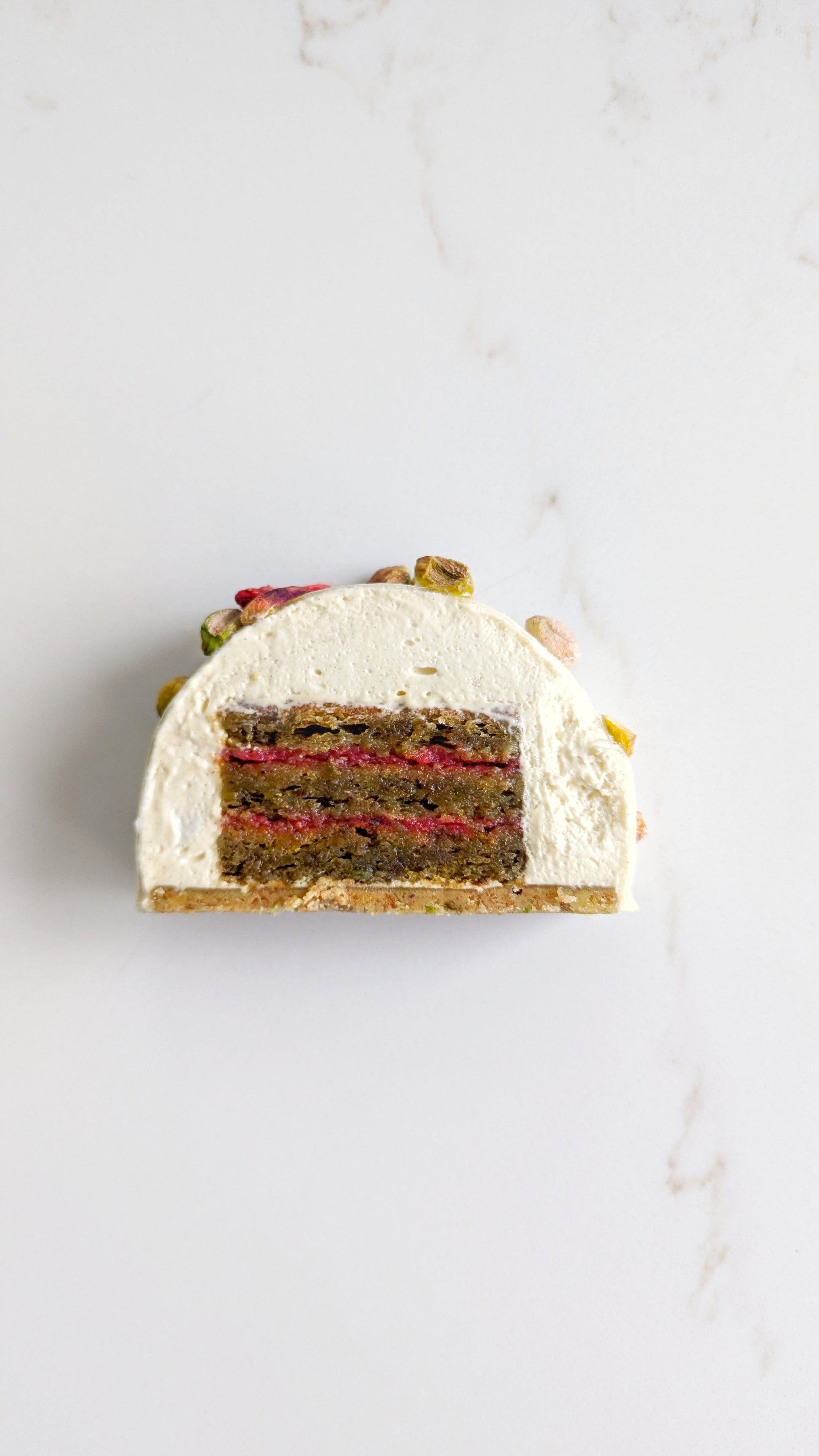 La douceur d’une dacquoise pistache s’unit à l’onctuosité d’une mousse chocolat blanc, rehaussée par une gelée de fraises du Québec, récoltées durant l’été. Les couches de feuilletine pistache apportent la touche finale croustillante.